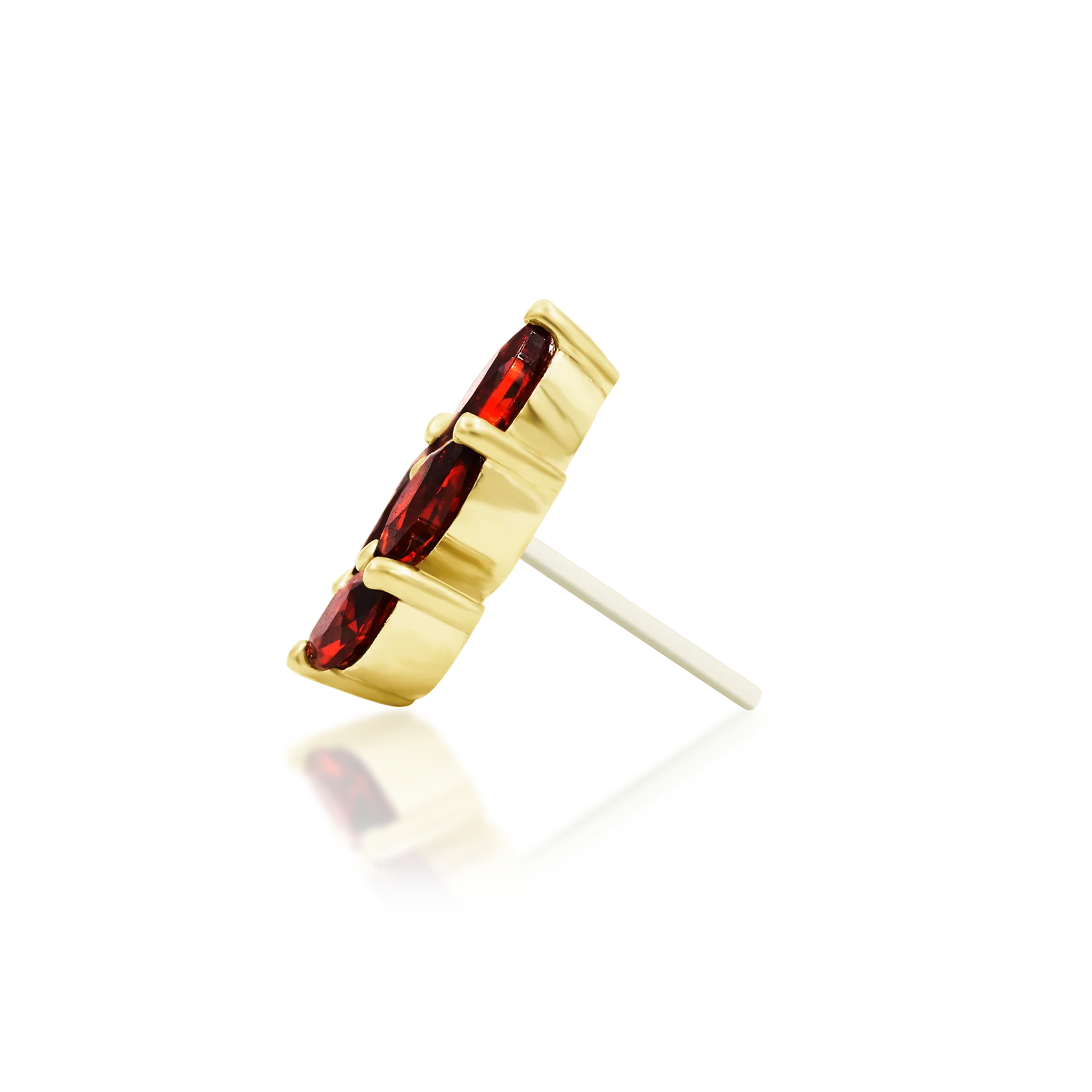 Four 3x1.5mm dark garnet marquise CZs create a stunning red blossom threadless and available in 14k yellow, white and rose gold.