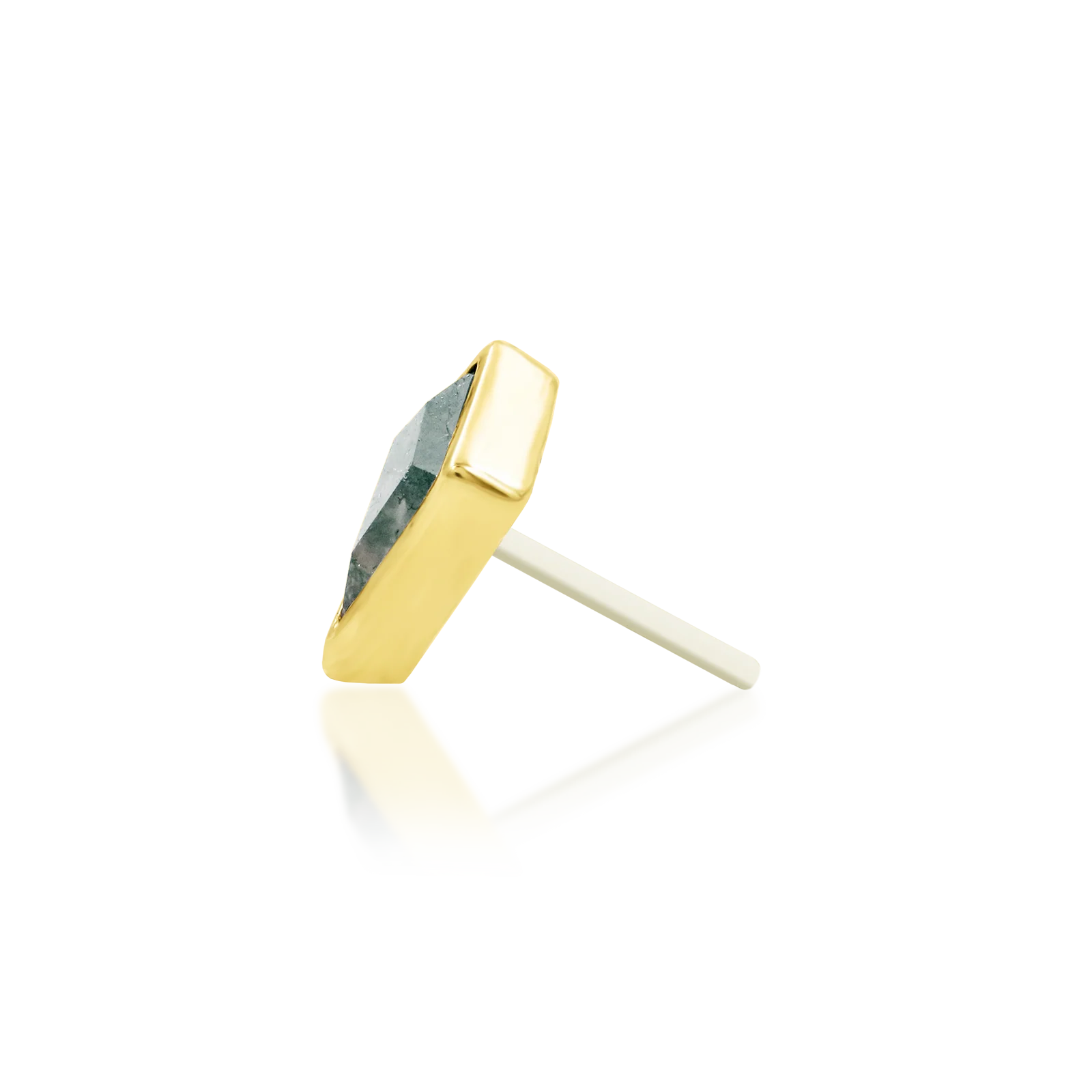 A 2.5x4mm diamond cute genuine moss agate stone wrapped up tight on a threadless 14kt bezel frame